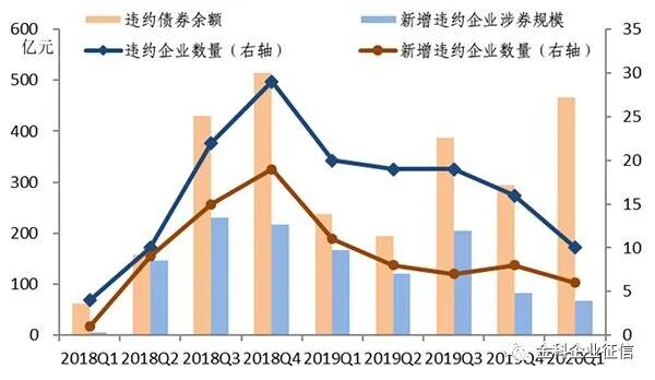 一是债券违约规模明显上升,但违约企业数量、新增违约企业数量和新增违约企业涉券规模有所下降。2020年一季度违约企业数量较去年四季度减少6家,但违约债券规模增加172亿元,主要原因是北大方正集团去年12月违约的“19方正SCP002”的20亿元债券延期到2月21日仍无法兑付,法院受理债权人的重整申请,北大方正进入重整阶段,其尚未到期的23只债券合计345.4亿元均视为违约,导致2月份违约规模高达369亿元,创历史新高。新增违约企业数量较去年四季度减少2家,违约债券规模减少15亿元。