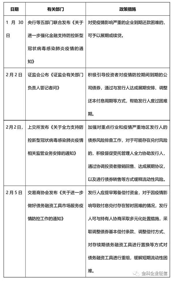 2月2日证监会公布《证监会有关部门负责人答记者问》积极引导投资者对疫情防控期间到期的公司债券,通过与发行人达成展期安排、调整还本付息周期等方式,帮助发行人度过困难期。2月2日,上交所发布《关于全力支持防控新型冠状病毒感染肺炎疫情相关监管业务安排的通知》加强对重点行业和疫情严重地区发行人的债券风险排查工作,对于可能存在兑付风险的,积极督促受托管理人全力协助发行人,通过协调投资者撤销回售、达成展期协议,以及进行债券转售等方式缓释流动性风险。