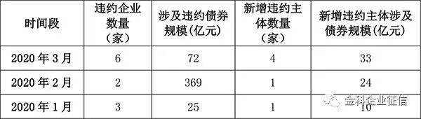 2020年3月份有6家企业发生违约,较上月增加4家,涉券规模72亿元,较上月减少297亿元。新增债券违约企业4家,较上月增加3家;涉及规模33亿元,较上月增加9亿元(参见表1)。