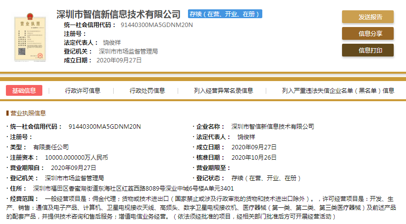 据悉,深圳市智信新信息技术有限公司的法定代表人为饶俊祥;注册资本:10000万人民币;成立于2020年09月27日;经营范围:一般经营项目是:佣金代理;货物或技术进出口(国家禁止或涉及行政审批的货物和技术进出口除外)。许可经营项目是:开发、生产、销售:通信及电子产品、计算机、卫星电视接收天线、高频头、数字卫星电视接收机、医疗器械(第一类、第二类、第三类医疗器械)及前述产品的配套产品,并提供技术咨询和售后服务;增值电信业务经营。