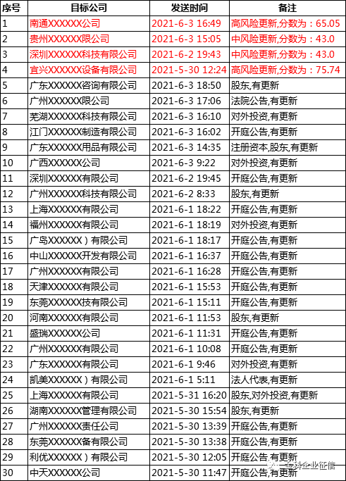 本周金征宝-风险指数监测的企业更新情况如下图,其中有4家企业是更新为中风险或高风险的,具体情况请登录我司金征宝查看,或留意我司发送的风险提示推送邮件。