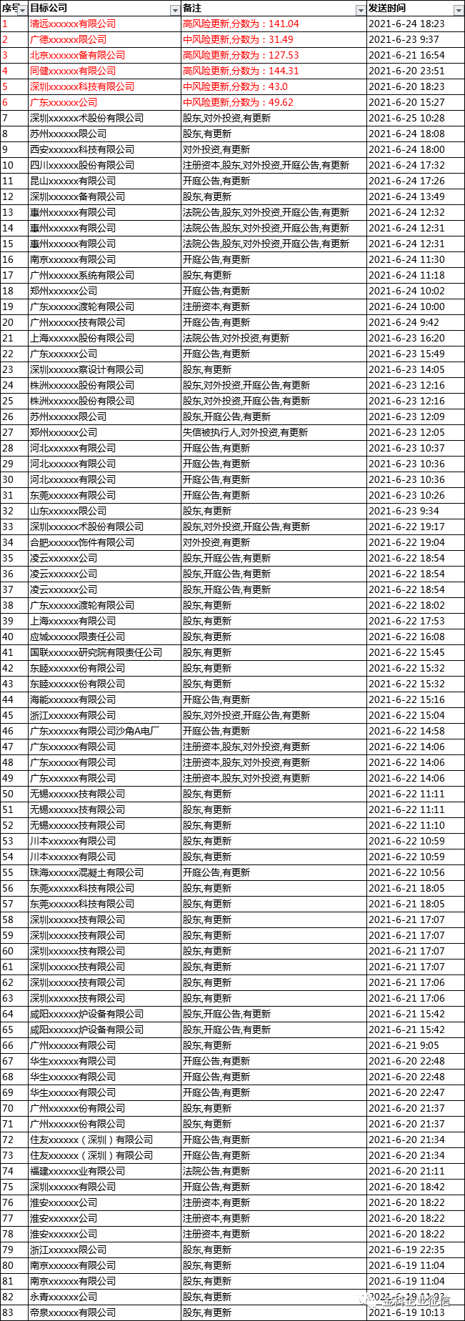 本周金征宝-风险指数监测的企业更新情况如下图,其中有6家企业是更新为中风险或高风险的,具体情况请登录我司金征宝查看,或留意我司发送的风险提示推送邮件。
